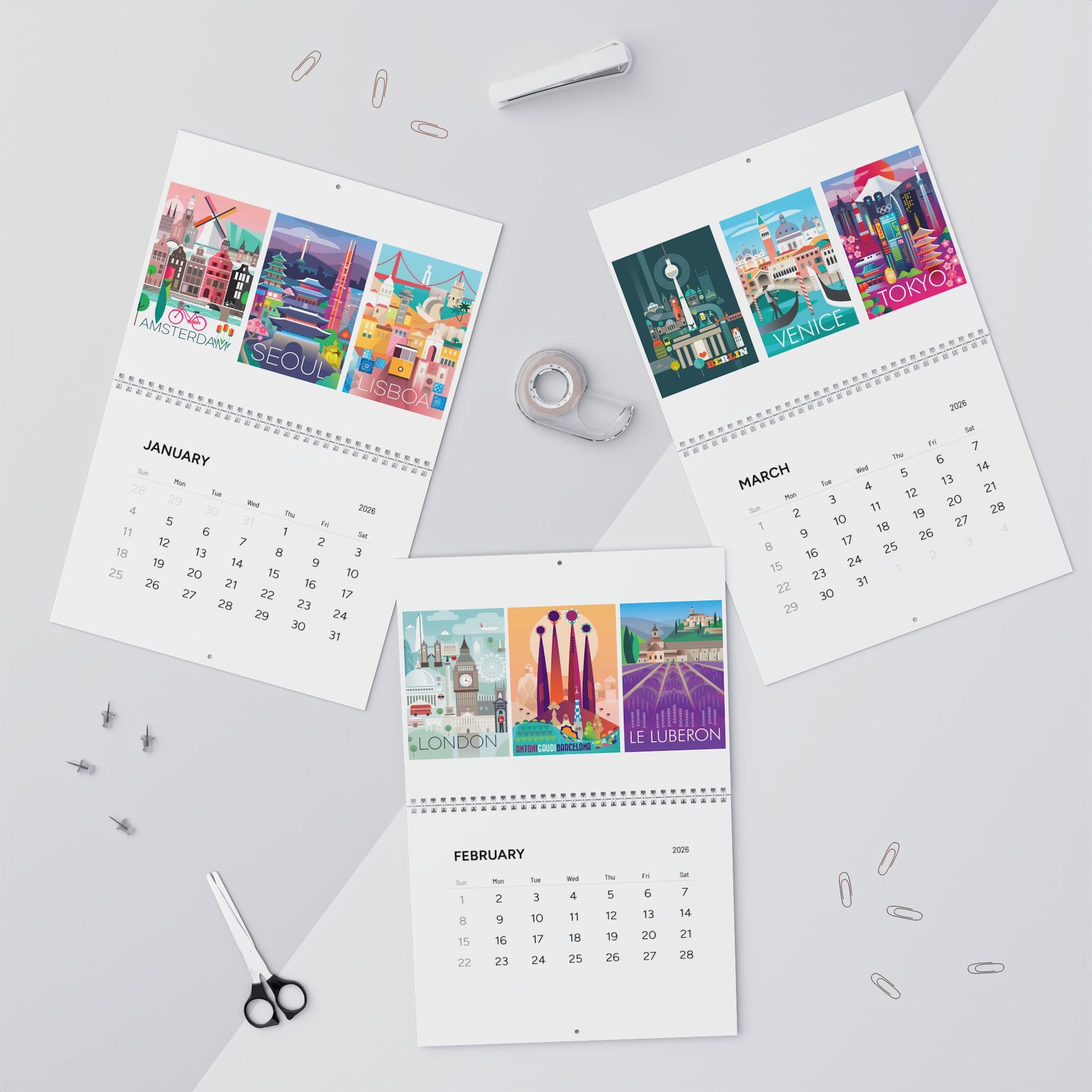 A year of original M&O city graphics! Each month features a large, vibrant illustration printed with crisp color reproduction on thick, premium paper. The month grids are matte and writable, so you can jot appointments, reminders, and notes without worrying about smudges. Wire coil binding and a centered hanging hole make it simple to flip through months and display the calendar in a kitchen, studio, or office.