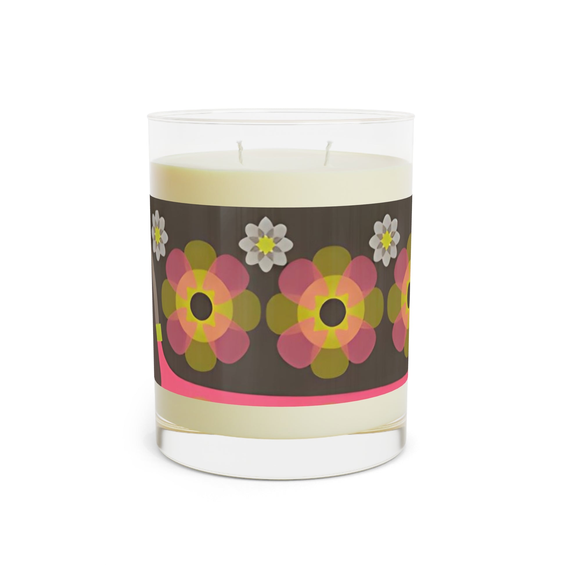 Light this glass candle and let a soft, cheerful moment settle in. The warm soy wax carries one of three carefully blended scents—White Tea & Fig, Lavender & Sage, or Ocean Mist & Moss—each layered so the fragrance unfolds slowly over hours. The 11oz full-glass vessel is wrapped in a retro floral pattern with playful, hand-drawn accents that bring a touch of vintage whimsy to kitchen counters, bedside tables, or home studios. Two cotton-cored wicks give an even, clean burn while the reusable glass and cardboard lid make it easy to refresh the space or repurpose the jar once the wax is gone. The overall feel is cozy, bright, and a little nostalgic—made to accompany quiet mornings, creative afternoons, or relaxed evenings with friends.