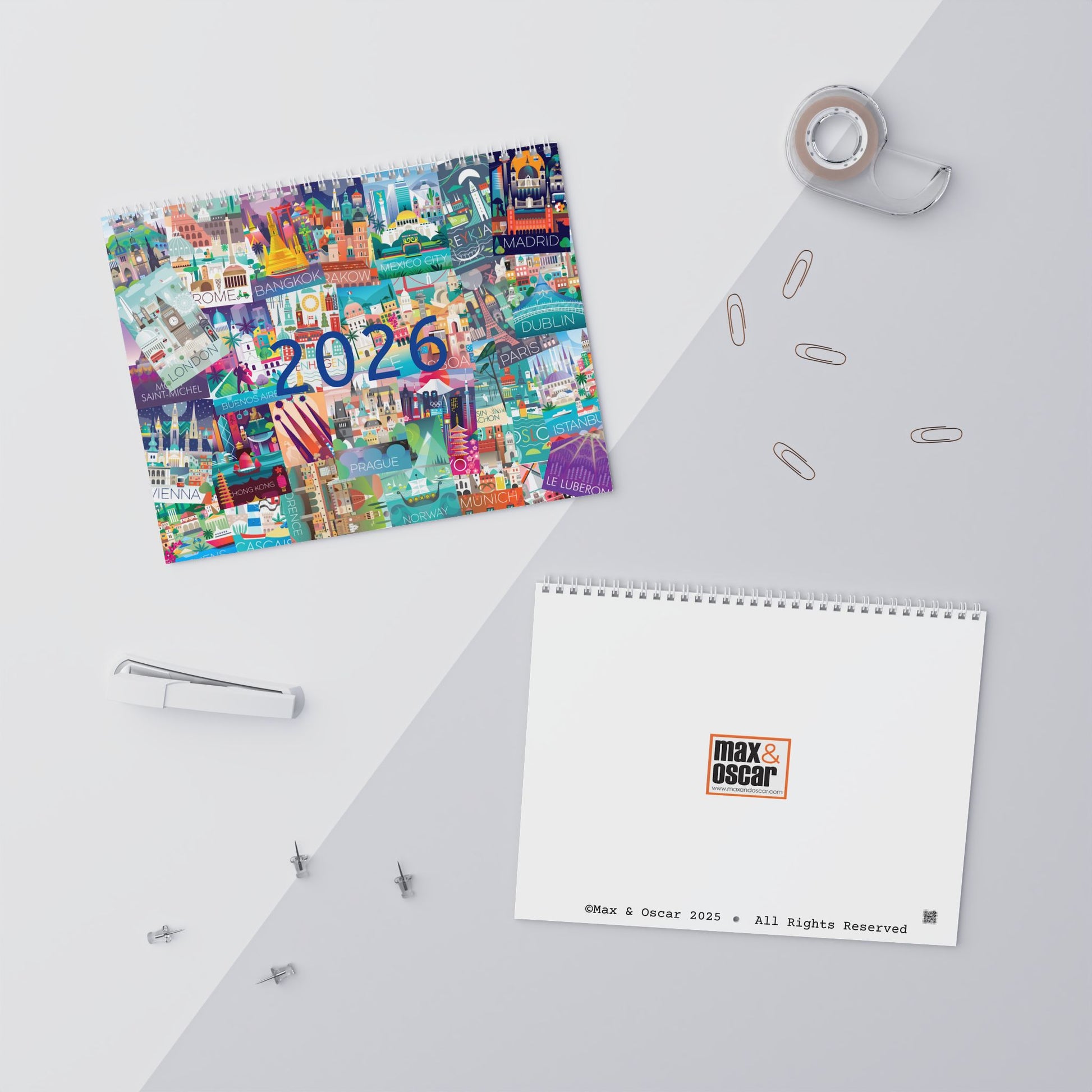 A year of original M&O city graphics! Each month features a large, vibrant illustration printed with crisp color reproduction on thick, premium paper. The month grids are matte and writable, so you can jot appointments, reminders, and notes without worrying about smudges. Wire coil binding and a centered hanging hole make it simple to flip through months and display the calendar in a kitchen, studio, or office. Product features